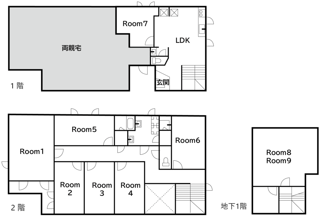 現在は定員9人のシェアハウスとして稼働しており、満室での月収は約62万円、年間収入は750万円前後。また当初の広いリビングを分割したうえで玄関を増設し、両親が住むワンルームの部屋を作成。外に家を借りる出費も抑えられ、以前に比べて収益性は2.5倍に向上した。