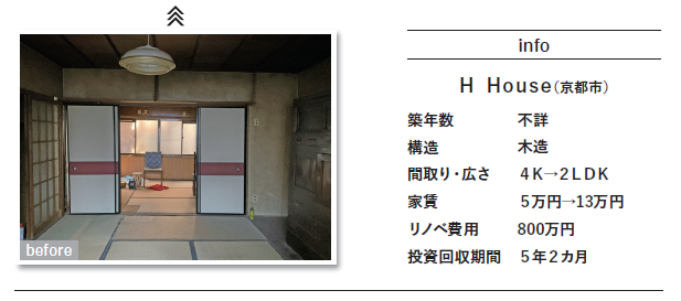 - 町家の築古物件を改修し家賃2.6倍を達成