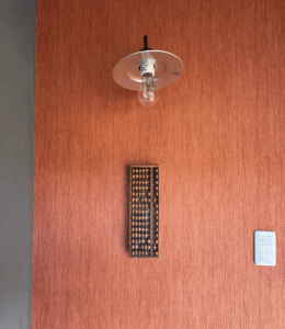 昔ながらのガラス戸の入り口を開けると、外観からは想像できないほどのモダンな内装に驚く。すぐ目につく壁のそろばんは、建物の名前の一部である「180」を指している。建物名と共に、この建物が1966年の竣工後、長らく質屋が営まれていた場所である歴史を示すアイコン的役割を果たす。