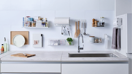 スパイスラックやふきんハンガー、ペーパーホルダーなど全10種類。すべてマグネット式で取り付けは簡単だ。シリーズで組み合わせて使うと統一感が出るため、すっきりとした空間を確保することができる。キッチン壁面のデッドスペースを活用し、キッチンの作業スペースを広げることが可能。