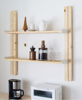 石こうボード用ピンを使って手軽に設置できる。付属のねじで取り付けることも可能だ。棚板の幅は50cmから110cmまでのサイズから1mm単位でオーダーでき、棚の奥行きも89mm、178mm、267mmの3種類から選べる。また高さも60cmと90cmの2種類があるため、場所に合わせた大きさの棚の設置ができる。