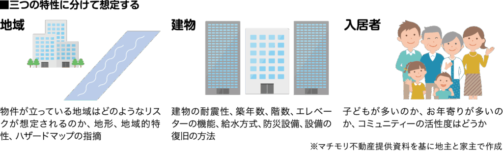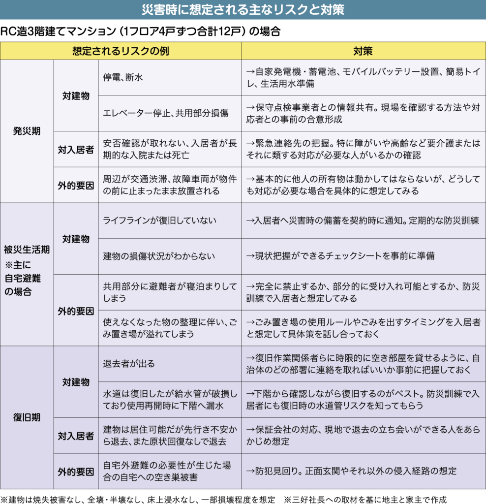 三好社長は「ただ漠然と災害に備えるのではなく、リスクを明確に想定することが大切です」と指摘する。さらに「地域」「建物」「入居者」の三つそれぞれについて考えるべきだと説く。