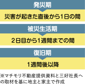 また三好社長は、災害を「発災期」「被災生活期」「復旧期」の三つの期間に分けて、リスクを想定することを推奨する。