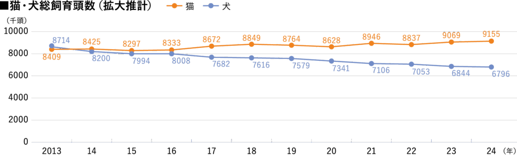 一般社団法人ペットフード協会(東京都千代田区)の調査によると、日本では2014年に犬と猫の飼育頭数が逆転し猫のほうが多くなった。24年の調査では、犬は前年に比べて世帯飼育率が下がった一方で、猫の飼育頭数はコロナ下に引き続き横ばいとなっており、飼育需要の根強さがうかがえる。