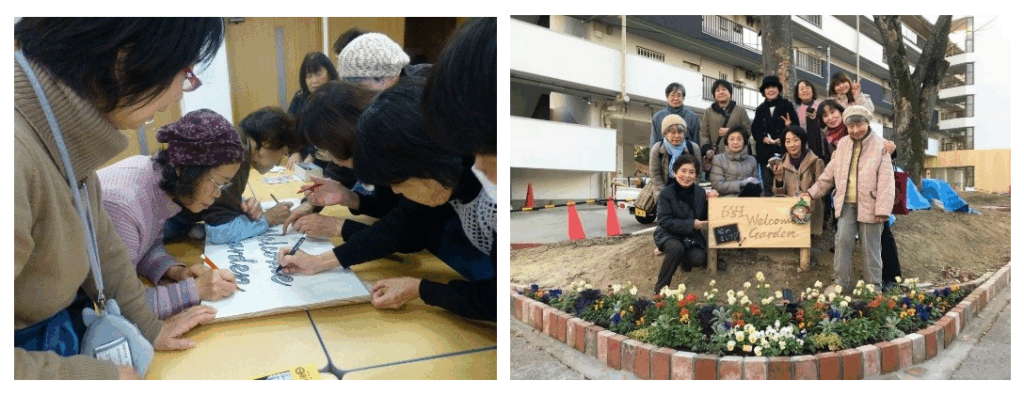 この成功を機に、工事中の空間を使い、住民と一緒にウェルカムガーデンの看板をDIYで作りました。普通はURが設置する看板ですが、住民にお願いすると驚きながらも、喜んで参加してくれました。この看板は、今も住民たちの誇りになっています。