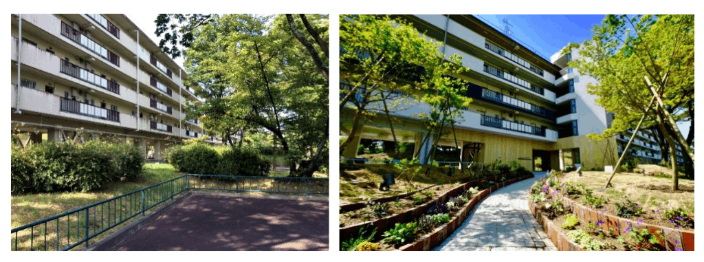 最初の舞台は、大阪の「UR千里青山台団地」です。ここでは、団地の屋外空間に住民と一緒に丸い庭をつくり、そこをきっかけにコミュニティーを育む「みんなの庭プロジェクト」が始まりました。