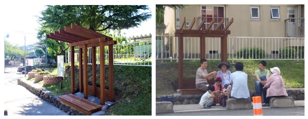 そうしたある日、「花が好きだから、少しやってみたい」という住民が現れ、小さな庭が一つ生まれました。殺風景だった場所に彩りが生まれたのを見て、団地の職人が「日よけをつくろう」と素敵なパーゴラを建ててくれました。そして、そこは自然と人が集う井戸端会議の場所になりました。