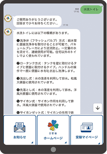 試験はオンライン方式。スマートフォンやパソコンで24時間365日いつでも受験することができる。受験料は9900円(税込み)で、テキスト・講習動画・試験料が含まれる。合格すると認定証がもらえるほか、「Chat(チャット)GPT」を活用した建物・設備のAI(人工知能)先生「AIメンテナンス主任者」を「LINE」のアプリで利用できる。このアプリは建物・設備に関する単語や質問を入力すると、瞬時にテキストの内容から回答・解説が返ってくるというものだ。入居者や施工事業者とのやりとりの際に便利だという声がある。