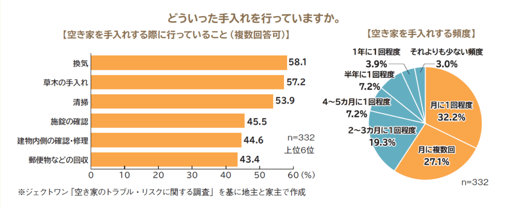 その一方で「2~3カ月に1回程度」(19.3%)や「4~5カ月に1回程度」(7.2%)という声があり、4割程度で管理頻度が低いこともうかがえる。中には1年に1回よりも少ない手入れで済ませている場合もあり、実質的には放置に近い状態にある空き家も少なくないようだ。