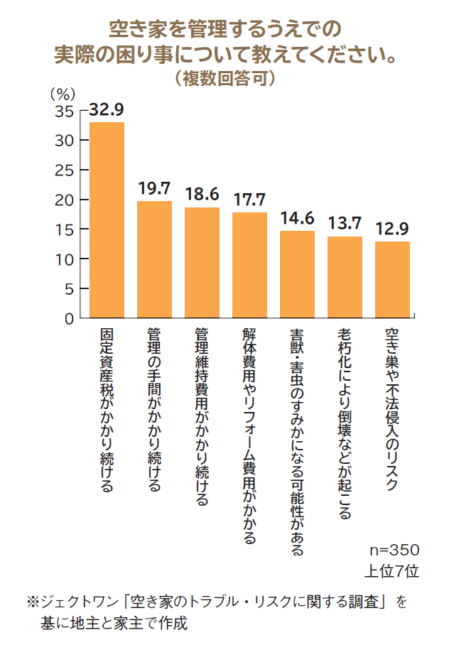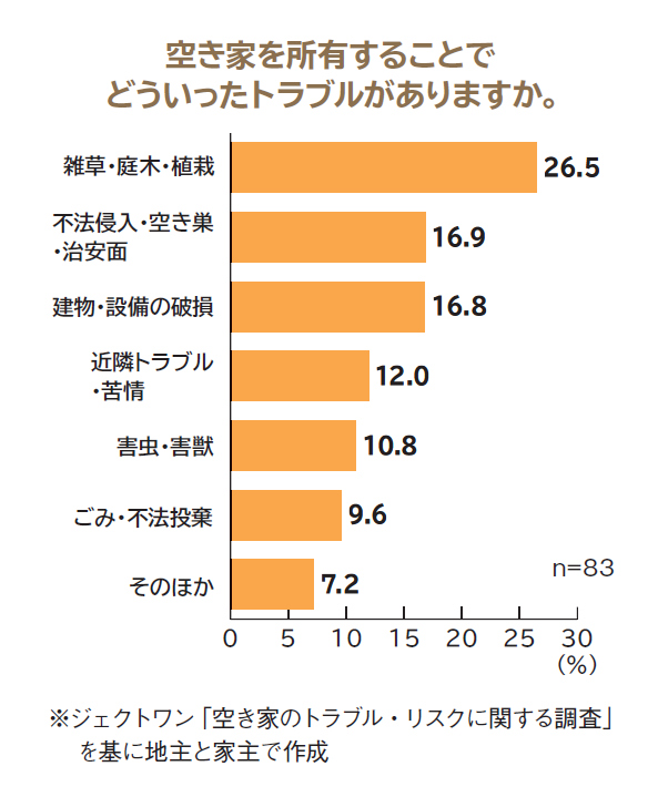 不動産の開発・リノベーションおよび空き家事業を展開するジェクトワン(東京都渋谷区)は、7月9~10日に「空き家のトラブル・リスクに関する調査」を実施。日本全国で空き家を個人で所有しているオーナーの回答から、空き家が抱える問題の実態が明らかになった。