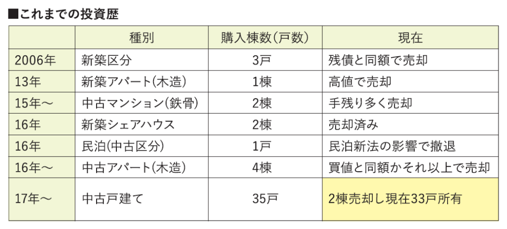 しかし、08年のリーマン・ショックの頃2戸が退去。一気に15万円の手出しがあったこと、空室リスクを実感したことで、それまでの経営に限界を感じた。そこで所有していた3戸を当時の残債額とほぼ同額で売却。以後は会社員として働きながら、13年に新築アパート1棟、15年から中古マンション2棟、16年に新築シェアハウス2棟、同年から中古木造アパート4棟と、業態にこだわらず不動産投資に挑戦していった。