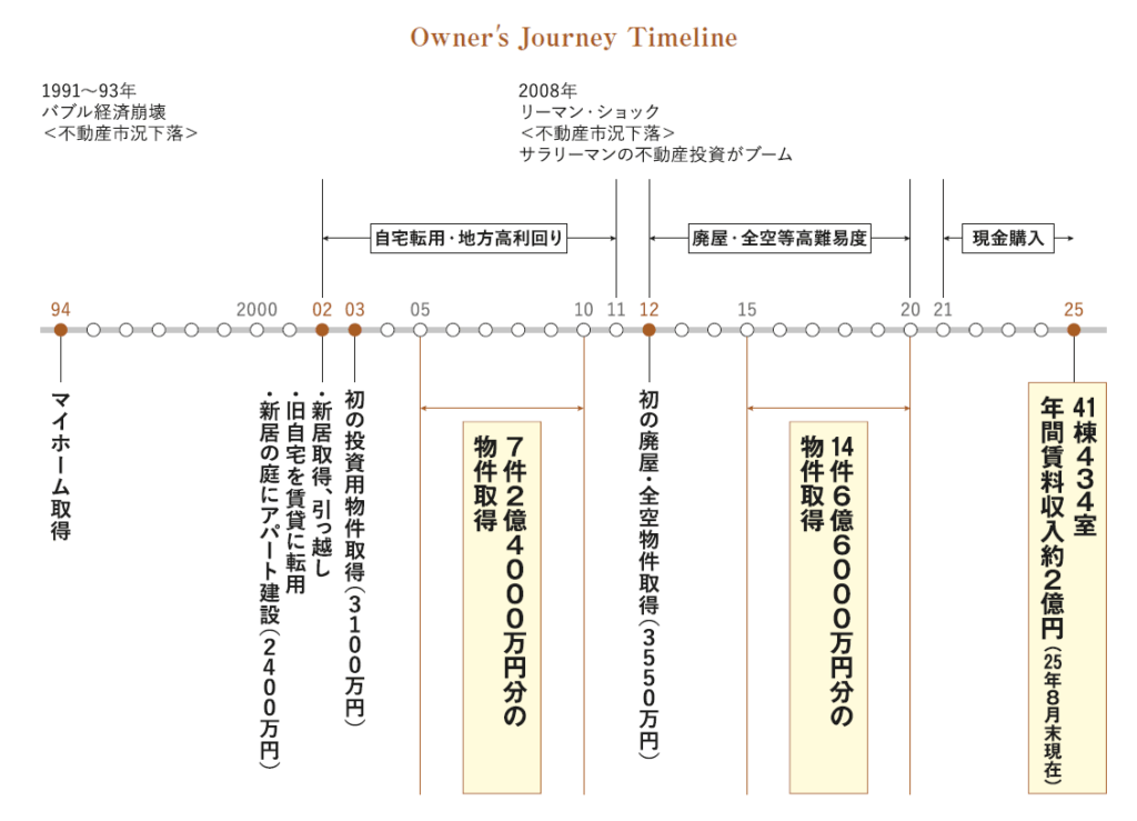 中島オーナーの不動産投資家としてのキャリアは、ふとしたアイデアで行った自宅転用から始まった。その後、地方高利回り物件を経て、廃屋・全空など高難易度物件という流れで資産を大きく増やしてきた。そして今「現金にこだわった購入」の段階に来ている。