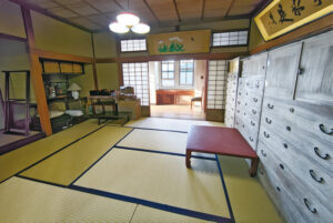 99年に国の登録有形文化財に登録された洋館は2027年には築100年を迎えようというのに堅固。足を踏み入れても軋みは全くない。築年数を聞いて驚く人も多いだろう。外壁や屋根の塗装、床の一部張り替えなどのメンテナンスを定期的に行っている。壁や天井は漆喰で仕上げたものだが、一部を除き建築当時のまま使い続けており、洋館内の照明や家具なども同様だ。1階の応接室は洋間だが、2階と3階は和室と洋間が隣り合う。階段を上ると現れるのは、外観からは想像もつかない和室だ。「建築については、和洋折衷の大正ロマン風が当時のはやりだったと聞いています」(渡辺オーナー)