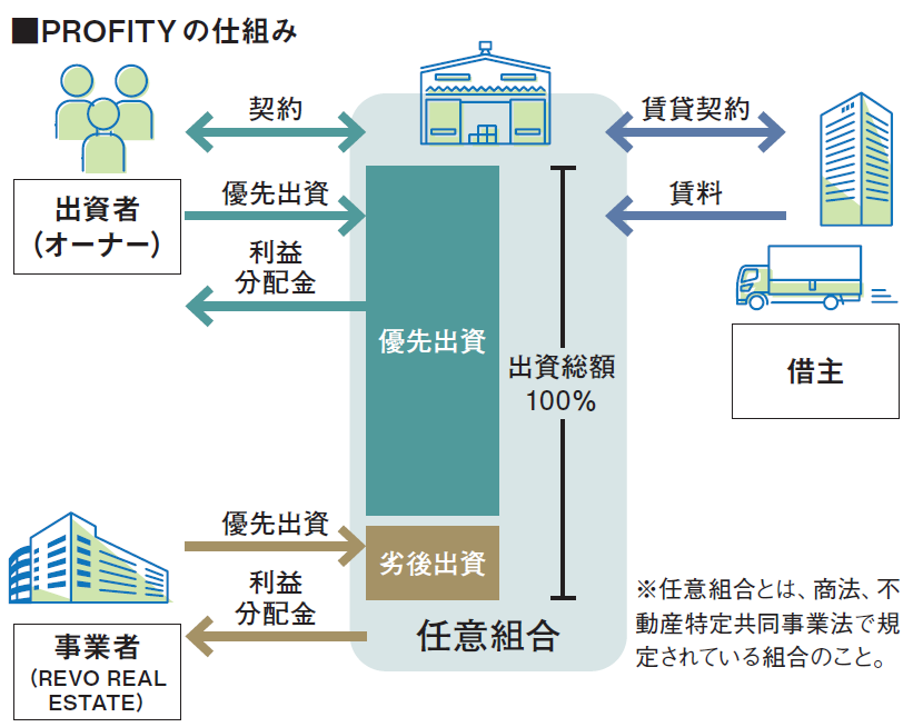 事業用倉庫の販売・管理を行うREVO REAL ESTATE(リボリアルエステート:福岡市)は倉庫の小口化事業を2月から展開している。「PROFITY(プロフィティー)」という商品で、不動産特定共同事業法における任意組合型の不動産小口化商品だ。第1号物件となる岡山県里庄町の倉庫は、7800万円の倉庫を1口100万円計78口で5月に募集を開始。1カ月以内に1人のオーナーがすべて購入したという。