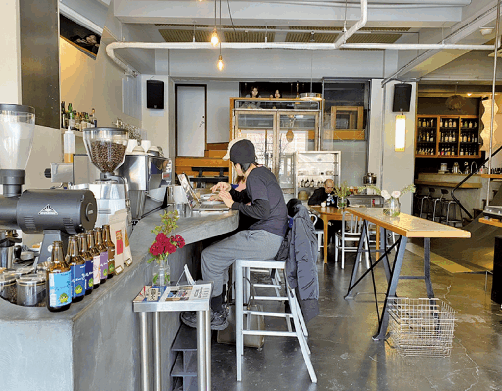 現在、同ビル1階には飲食店が入る。昼はカフェ、夜は日本酒バーとして営業しており、一日中、人の流れが絶えない。