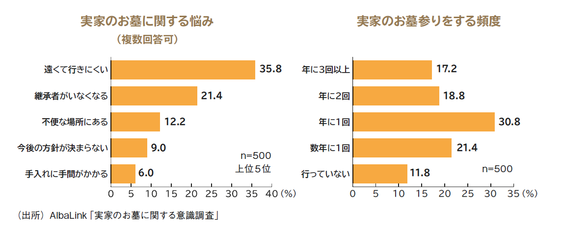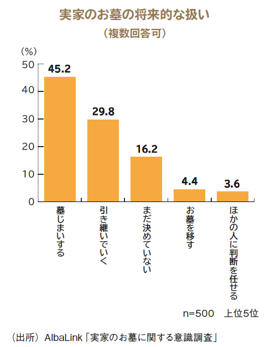 事故物件、共有持ち分、空き家、底地・借地など、訳あり不動産の買い取り再販事業を行うAlbaLink(アルバリンク:東京都江東区)は、8月27日に「実家のお墓に関する意識調査」としてアンケート調査を実施。全国の男女500人から有効回答を得た。
