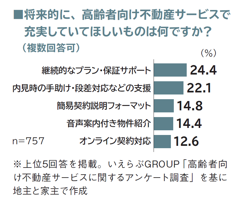 将来的に充実していてほしい高齢者向け不動産サービスは何か、については「継続的なプラン・保証サポート」が最多。2番目に多かったのは「内見時の手助け・段差対応などの支援」だった。単発の対応だけでない継続的なサポートや、高齢者の生活様式や身体的な状況に合わせたサービス提供が求められていることがうかがえる。
