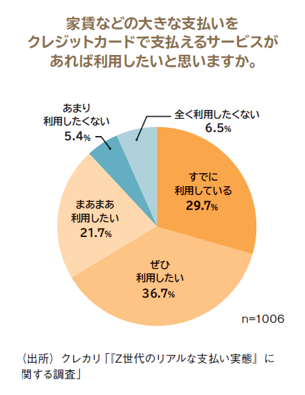 そこで、家賃などの大きな支払いをクレジットカードで行うことができるサービスがあれば利用したいかという質問を行うと「すでに利用している」(29.7%)、「ぜひ利用したい」(36.7%)、「まあまあ利用したい」(21.7%)を合わせ、約9割が肯定的に回答した。家賃の支払いの選択肢が増え、家計管理の利便性が向上することへの期待も高いようだ。