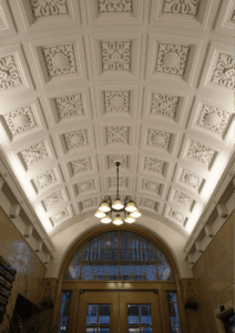 - ▲元は彩色が施されたエレベーターホールの天井だったが炊き出しをこの場で行った際の汚れが付着したため白く塗装した