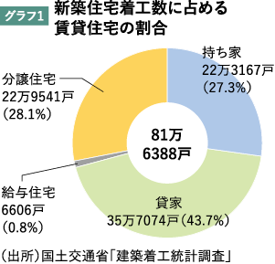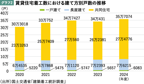 建築着工統計調査によれば、2024年度に全国で着工した新築住宅の戸数は81万6388戸。そのうち43・7%を占めたのが賃貸住宅(貸家)で35万7074戸だった。