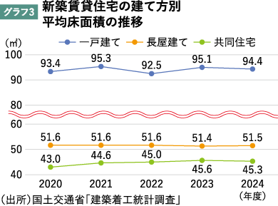 建て方別の1戸あたりの平均床面積を見てみると、24年度は共同住宅が45・3㎡、長屋建てが51・5㎡、一戸建てが94・4㎡という結果だった。