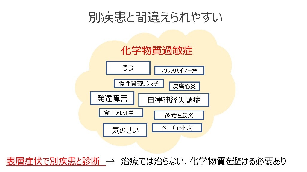 そしてもう一つ、私がお話しするうえで欠かせないのが「化学物質過敏症」の患者としての立場です。私は殺虫剤などの化学物質にさらされると、いわゆるひどいアレルギーのように、身体が過敏に反応します。その症状は多様であり、例えば、人の話し声は音として聞こえているのに、何を言っているのか全く理解できなくなるなど、言語理解力や思考力までもが著しく低下してしまうのです。ダニエル・キイスの小説『アルジャーノンに花束を』で描かれる、知能が上がりそして再び下がっていくあの悲しい過程を、私は実体験として体感しています。