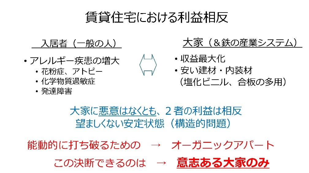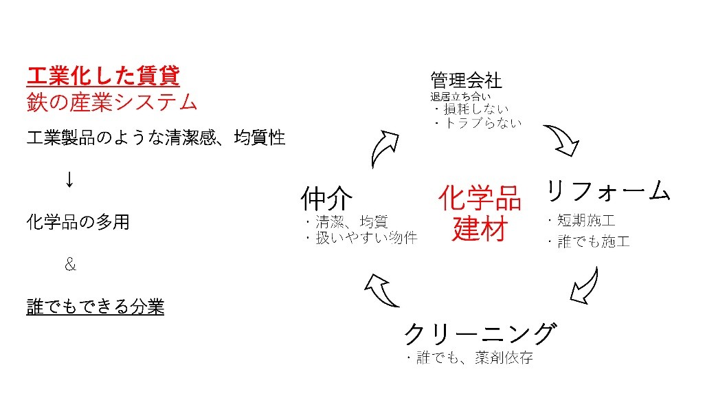 そういった状況を前提に賃貸住宅の業界構造を見てみましょう。管理会社は退去時のトラブルや損耗を避けたいと考え、リフォーム業者は誰でも手早く安価に施工できる方法を求めます。仲介業者は均質で清潔感のある扱いやすい物件を好み、クリーニング業者は強力な薬剤に依存します。結果として、安価で施工性の高い化学品建材を多用する仕組みに陥っているのです。効率、均質を求めて工業化しているとも言えるでしょう。大家側も収益を上げるためにコストダウンの方策として、悪意はなくとも、結果的に入居者の健康や安全性を損なうリスクのある安い建材を使ってしまいます。このように、現在の賃貸住宅においては大家と入居者の利益が相反する構造的な問題があると言えるかと思います。