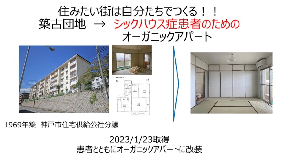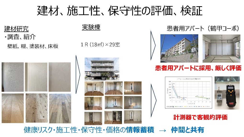 私たちのミッションは、意志ある大家たちの良い部屋づくりをサポートし、将来世代を建材由来の健康リスクから守ることです。神戸の古い団地の一室を購入して実験棟とし、体に良い建材を自ら施工して、VOC(揮発性有機化合物)などの室内空気質を計測器で測り、患者に実際に過ごして評価してもらうという試みを行っています。例えば、クッションフロアなどの塩化ビニル製の床をタイルや無垢の木材に張り替えたり、塩化ビニル製の壁紙をやめて和紙をでんぷん糊で貼ったりしています。また、押し入れの合板を石こうボードやアルミ複合板に替えたり、防虫シート入りの畳の代わりに炭化コルクとアルミシートを敷いて断熱効果を持たせたりと、様々な工夫を凝らしています。
