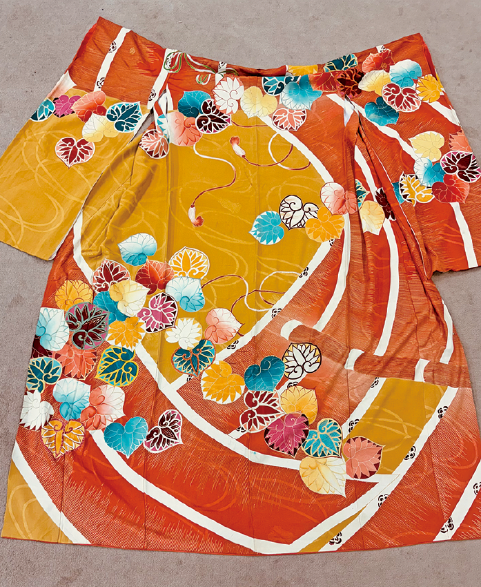 ▲昭和初期のものと思われるアンティーク着物。現代では再現困難な素材や染色方法を使用しているものも多い