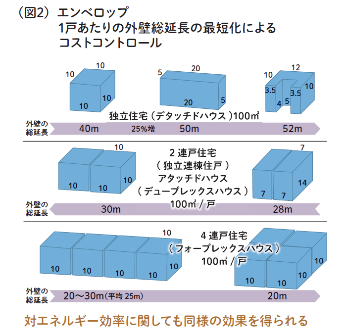 その一部を紹介すると、外壁の総延長を最短にすることです。図2のように1戸あたり100㎡の床面積でさまざまな考え方を記載しましたが、戸建てならば、正立方体が最も総延長が短く、日本では「中庭のある暮らし」などのコピーで宣伝をしている住宅メーカーもありますが、中庭を配した住宅は最もコストがかかるということがわかります。