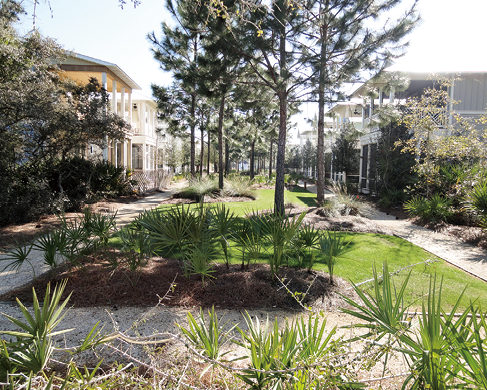 メキシコ湾に面した「ウォーターフロント」型住宅地では植生は湿地や湿潤林の植物が多く、芝や庭木よりも湿地対応の植物を使用される(フロリダ州パレットタウン)