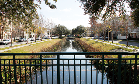 住宅地の中心を通る人工河川。この水はダウンタウンに設置される人工湖へとゆっくりと流れ、住む人々に潤いを与えている(フロリダ州セレブレーション)