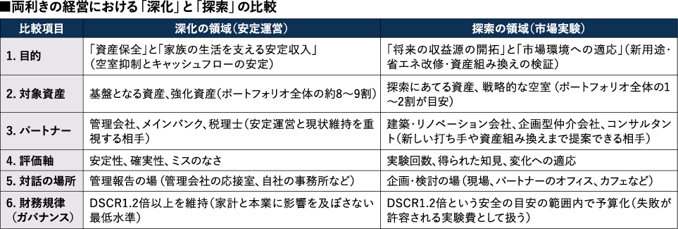 両利きの経営は、既存事業を深める「深化」と、新しい打ち手を試す「探索」を同時に進める考え方です。地主・家主は、管理会社や金融機関、建築会社など外部専門家を自身の組織と見なし、役割を分けて使う必要があります。ここで、既存入居者への対応や家賃回収を担う「守り」の深化パートナーと、省エネルギー改修や新業態テナントといった「攻め」の探索パートナーに役割を分けます。