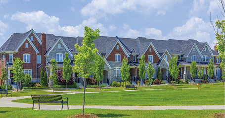 一見すると豪邸のような外観だが、実際は6棟から成るアメリカ北東部のタウンハウス(連棟戸建住戸)。調和の取れた街並みは、アメリカンデザインの真骨頂といえる。また、広大なコモンガーデンにはベンチが置かれて、住民が穏やかな時間を過ごすための装置となる。