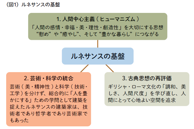 暮らしを総合的に研究し、住環境を改善するための組織や専門家は存在しているものの、欧米のような幅広い視点や学際的な取り組みまでのレベルには到底届いていません。また建築教育は建築工学を主体としており、最も重要なルネサンスの基盤(図1)となる「慰め」や「癒やし」などを含めた“人間中心主義(ヒューマニズム)”をテーマに“建築を人間の心の豊かさのために学び・つくる”という思想的な原点を教える建築学科も存在しないため、住宅産業の根本的な理念形成ができず、思想的な土台が育たないのです。
