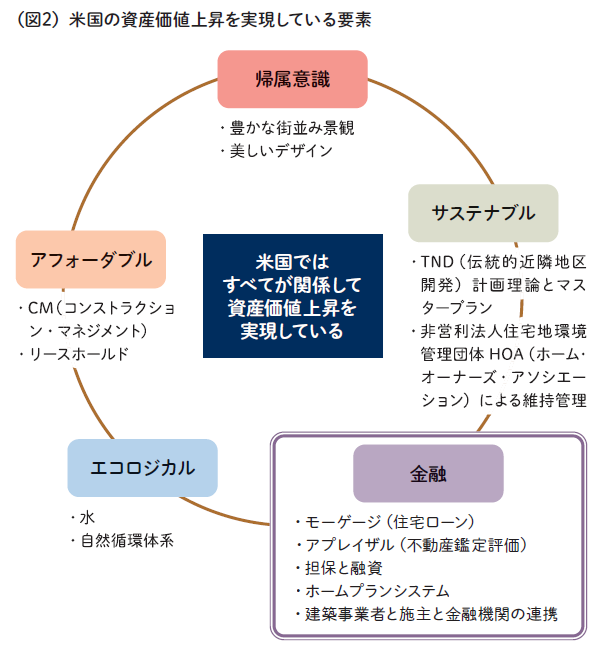 最後に、これまでの連載で説明してきた内容は(図2)の四つに該当し、どれ一つとして欠いてはならない要件です。さらにいえば「お金」すなわち金融やそのシステム、不動産の評価基準であるアプレイザル(*2)なども加えて実行すれば、より健全で長期的な住宅運用の仕組みが整い始めるでしょう。