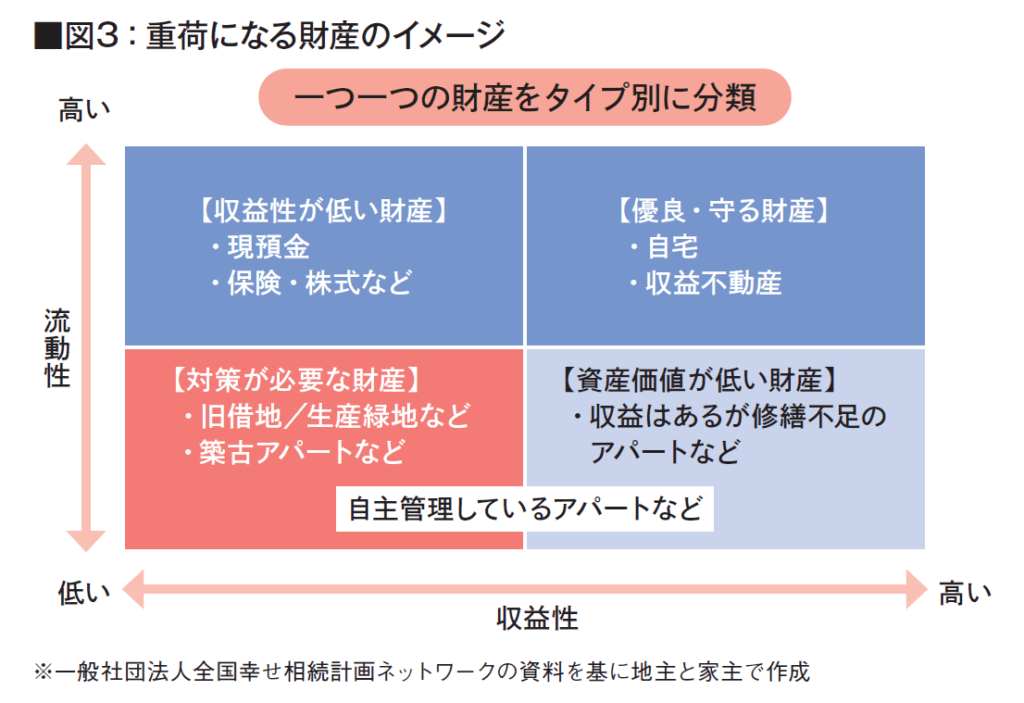 そのためには、図3のように、相続が発生する前に「流動性」と「収益性」に分けてグラフを作成してみよう。相続発生後に納税資金をねん出しようとした際、売却できるのは収益性と流動性が共に高い資産価値のある不動産になる。そうすると相続人に残されるのは売却できない収益性も流動性も低い不動産、つまり図の赤い部分の不動産となってしまう。だからこそ、事前対策としてこの赤い部分の不動産について収益化を図るか売却するかを検討して対処し、価値の高い不動産を家族に残すことが重要となる。