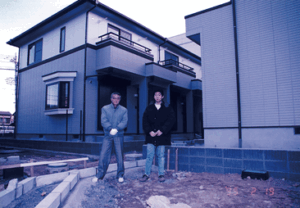 - ▲建築途中の様子。須賀オーナー(右)と父