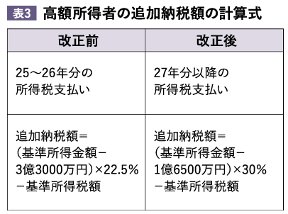 改正前の所得税で加算が発生する目安の所得は30億円だったが、27年分以降の所得税支払いではこれが6億円程度になるという。高額所得者として所得税が加算されるケースが増大する見込みだ。