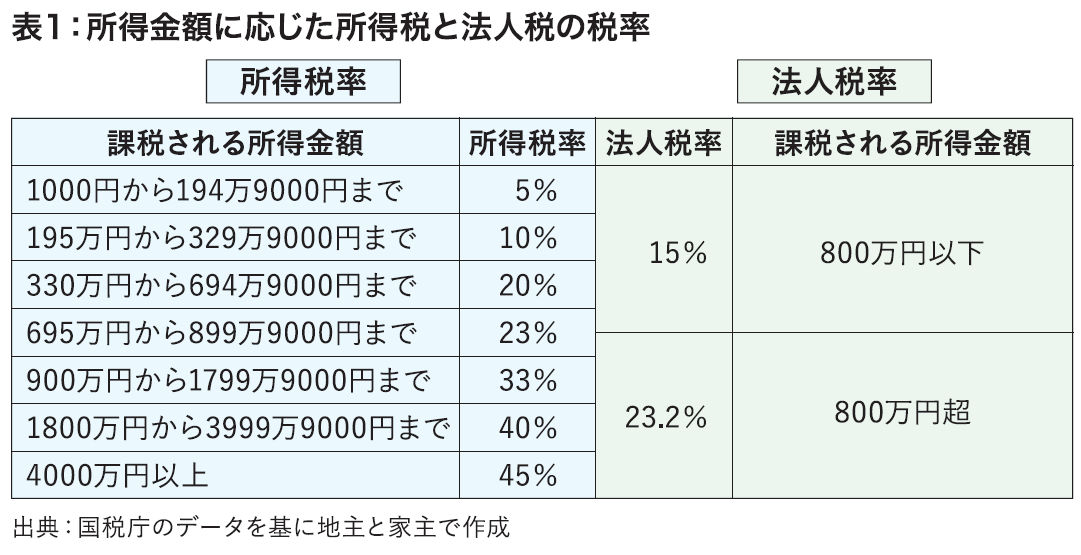 税率が抑えられること以外にも、法人化にはもう一つ大きなメリットがある。所得の分散だ。個人事業の場合、所得は全て家主であるオーナー1人に集中してしまう。法人を設立して建物を法人の所有にするなどすれば、所有は分散され、結果、個人・法人それぞれが支払う税金も少なくて済む。