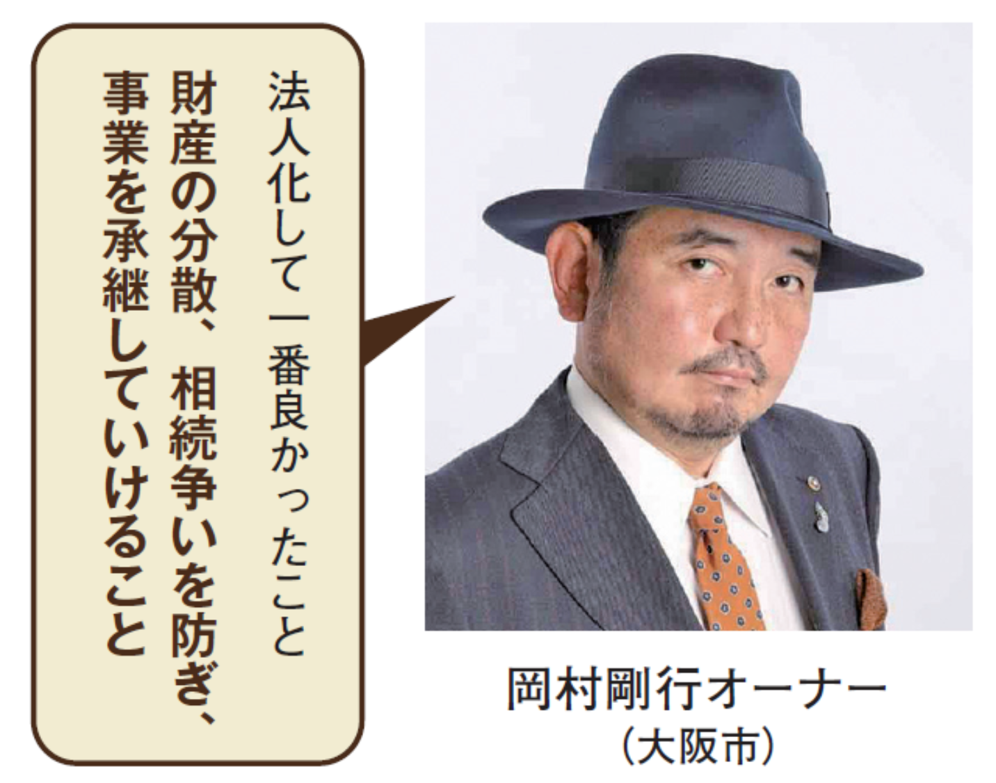 大阪市を中心に物件を所有する岡村剛行オーナーは、36歳の時に父親の相続が発生し、賃貸経営を始めた。父親は資産管理法人として有限会社を設立していたが、幽霊会社状態だった。そこで、その会社で所有物件を借り上げ、サブリース方式での経営を開始。その結果、当時5000万円あった不動産所得を分散させ、節税を実現。2年後、会社を株式会社へ組織変更した。