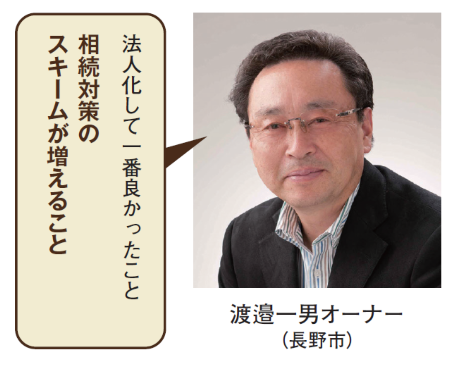 相続対策を行う中で、建物の減価償却費の減少によって税金が上がることに気付いた渡邉オーナーは、13年に法人を設立。返済が終わった建物を法人所有とし、所得の分散を図ることにした。その結果、家賃収入が法人に入るようになり、個人所得を大きく下げることができた。