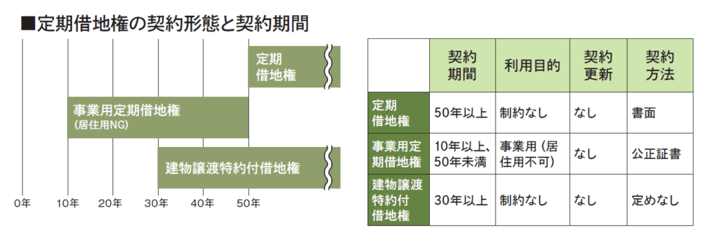 契約期間は50年以上。書面での契約が必須であり、契約の更新は認められない。利用目的の制約はなく、契約期間などの理由からマンション用地など長期プロジェクトに活用される事例もみられる。