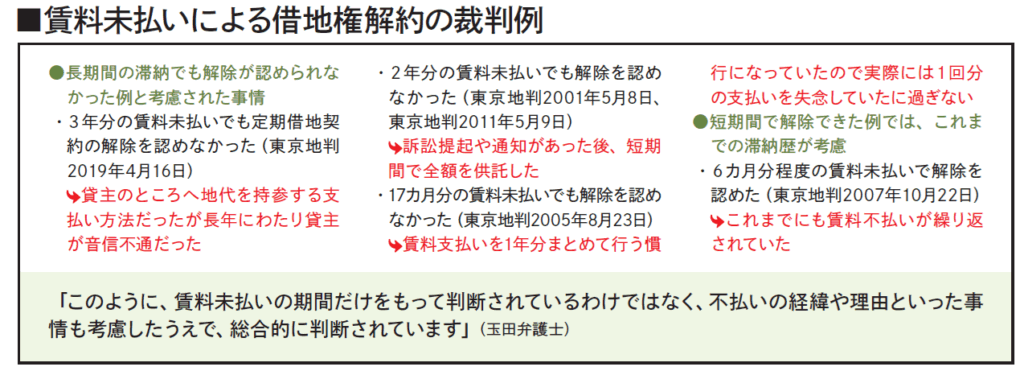 この点、解除に至る明確な基準はなく、事情に応じた個別判断となるが、実際、借地契約において半年〜1年の滞納があっても契約解除が認められない事例もあるという。