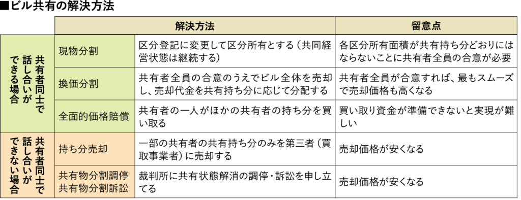 共有状態の解消とは若干趣旨が異なりますが、そもそも共有を問題としないために、あらかじめ資産を管理・運用する法人を設立して、その法人にビルを所有させておくという方法も考えられます。