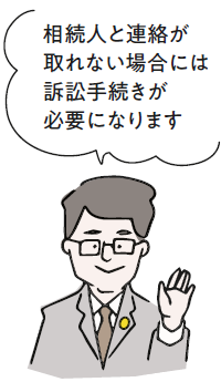 一方で、相続人と連絡が取れない場合には訴訟手続きが必要になります。また相続人が明らかでない場合には、相続財産法人が成立し(民法951条)、相続財産を清算する必要が生じます(民法952条など)。この手続きはまれなケースであるため、専門家に相談しましょう。