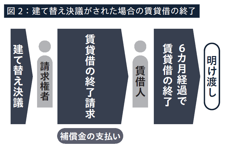 新法では、建て替え決議が成立した場合には、当該専有部分の区分所有者らが賃借人に対して賃貸借の終了請求を行うことで、請求があった日から6カ月を経過すると契約を終了させることができるようになる。ただし、賃借人保護のため、賃借人に対して通常生ずる損失の補償金を支払う必要がある。(図2参照)