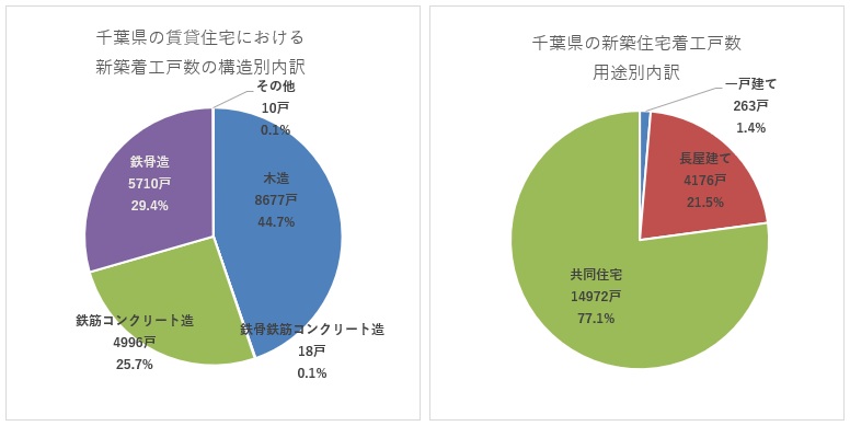 千葉県の新築着工総戸数が前年度比で1.2%の減少となる中、賃貸住宅は前年度比で12.0%と大きな伸び率となりました。その構造別内訳を見ると、木造が8677戸で最多、次いで鉄骨造が5710戸、鉄筋コンクリート造が4996戸、その他10戸の順となっています。
