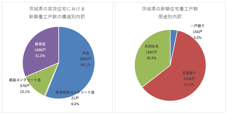 構造別内訳を見ると、茨城県の賃貸住宅着工数の56.1%となる2662戸が木造で最多。次いで鉄骨造が1490戸、鉄筋コンクリート造が576戸の順となっています。