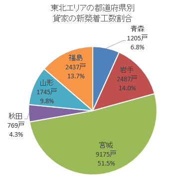 さらに賃貸住宅着工戸数の割合を見てみると、宮城県が半数以上を占めており、以下は岩手県、福島県、山形県、青森県、秋田県の順。宮城県と山形県では23年と比べてそれぞれ9.1%増、31.1%増と増加した一方で、その他の県では減少しました。